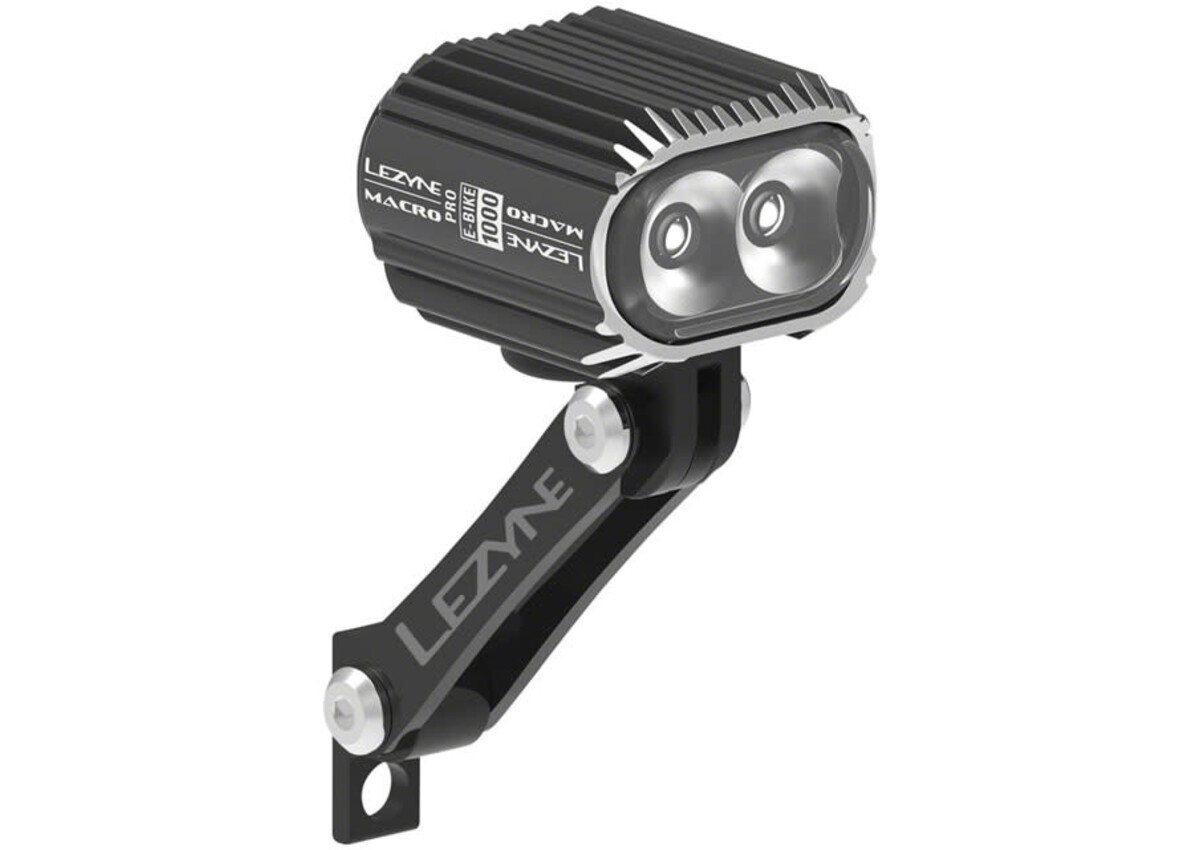 Lezyne Ebike Macro Drive 1000 Headlight. A High-performance light constructed of durable, heat-dissipating CNC machined aluminum with two ultrahigh-output LEDs that deliver up to 1,000 lumens.