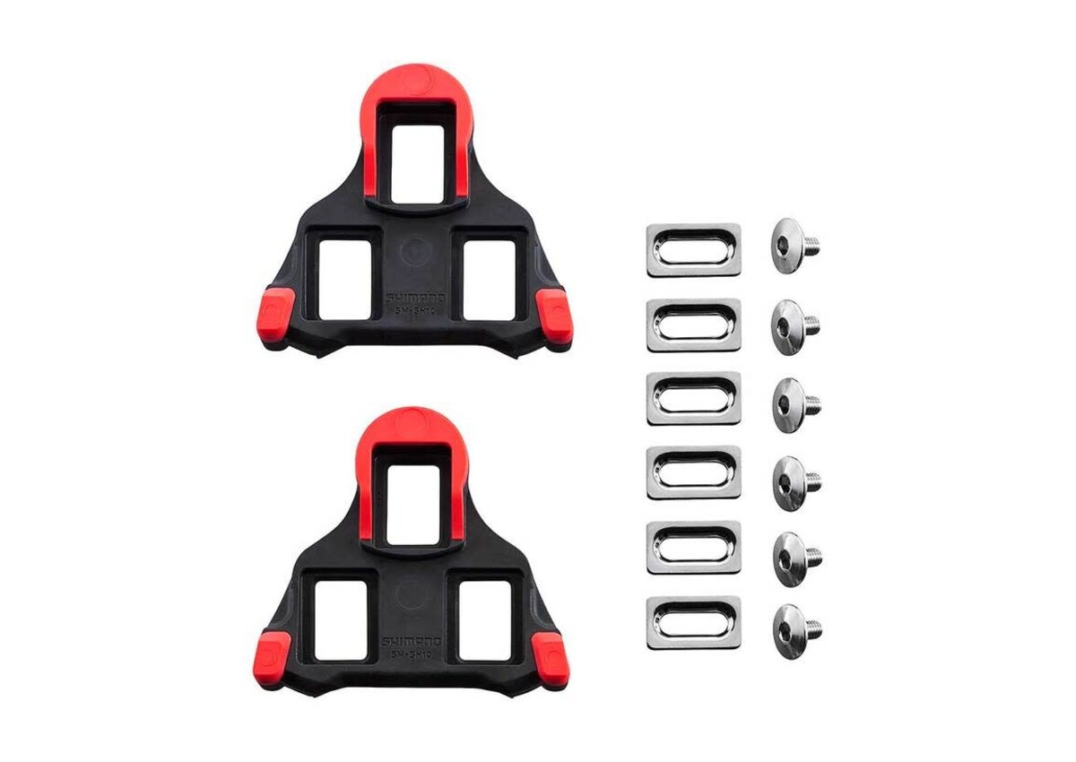 Shimano SPD-SL cleats are an extra-wide low-profile cleat and binding mechanism This platform creates a highly stable interface between the shoe and pedal. The red SM-SH10 cleats are fixed with 0 degrees of float.