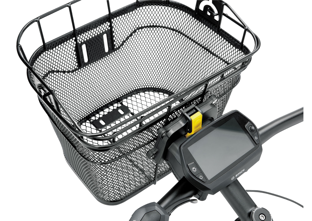 A sturdy handlebar-mounted metal basket for shopping trips, quick jaunts around town. New QuickClick™ Handlebar Mount (Fixer 3e) allows installation on eBikes to make attachment and removal a breeze.