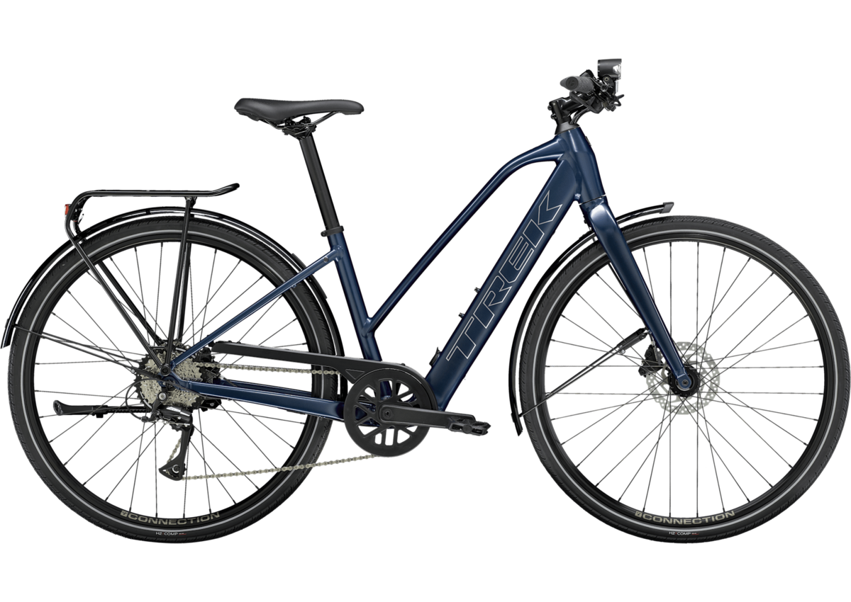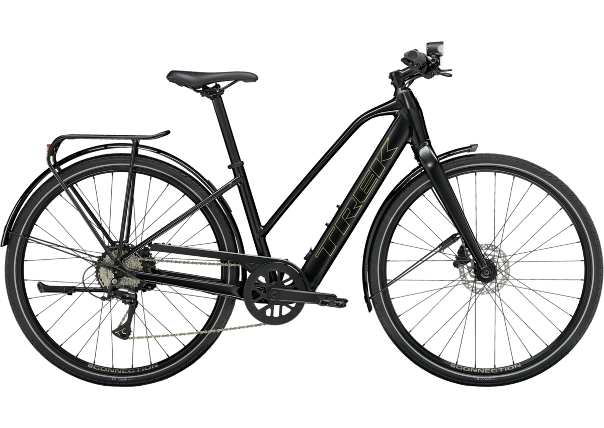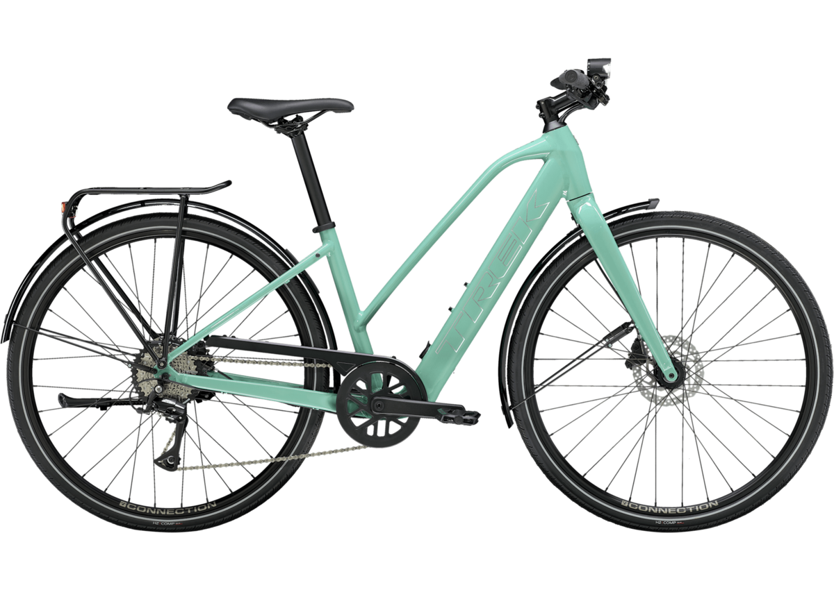 A lightweight aluminum frame with a stagger design that makes it easier to hop on and off, Trek's proprietary pedal assist system by Hyena with a hub motor (250W, 40Nm) that assists up to 20 mph, and a 250Wh battery for a range of up to 35 miles per charge. Plus, fast 700c wheels, fast-rolling yet stable 40c tires with reflective sidewalls, a reliable 8-speed Shimano drivetrain, hydraulic disc brakes, integrated lights powered by the battery, an MIK-compatible rear rack, fenders, and a kickstand.