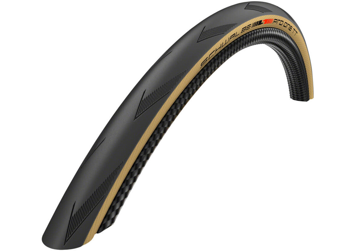 The Schwalbe Pro One TT tire design features a Super Race carcass and Addix Race compound to help maximize weight and reduce rolling resistance, ready to take you to the finish line.