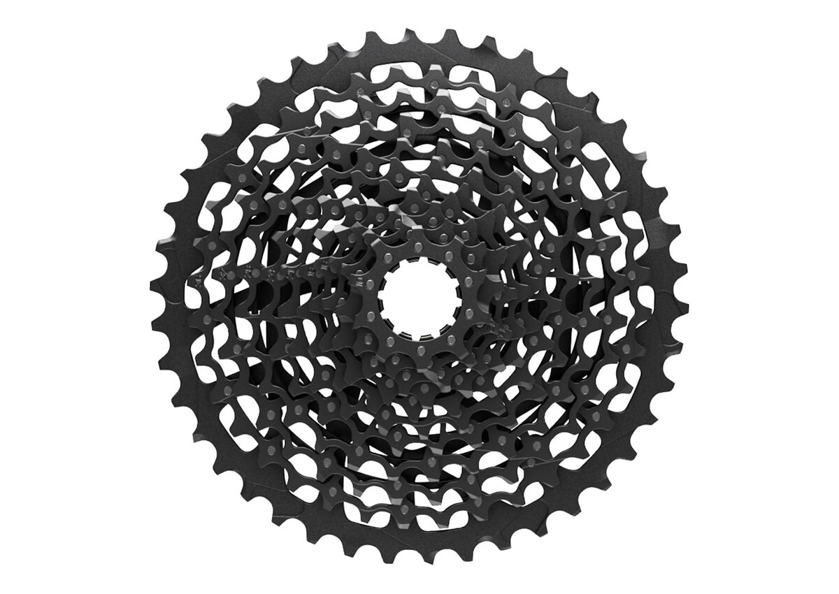 FULL PIN™ technology uses ten lightweight, stamped steel cogs and one 42t aluminum cog held together with 123 high-strength stainless steel pins. The result: a cassette that's light, durable and equipped with SRAM's super wide 10-42t gear range.